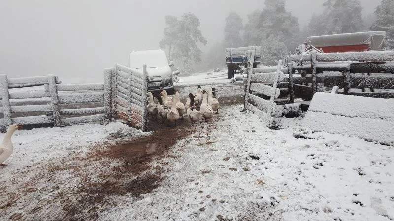 Karabük’te hava sıcaklığının sıfıra inmesi sonrası yüksek kesimler yağan karla beyaza büründü.