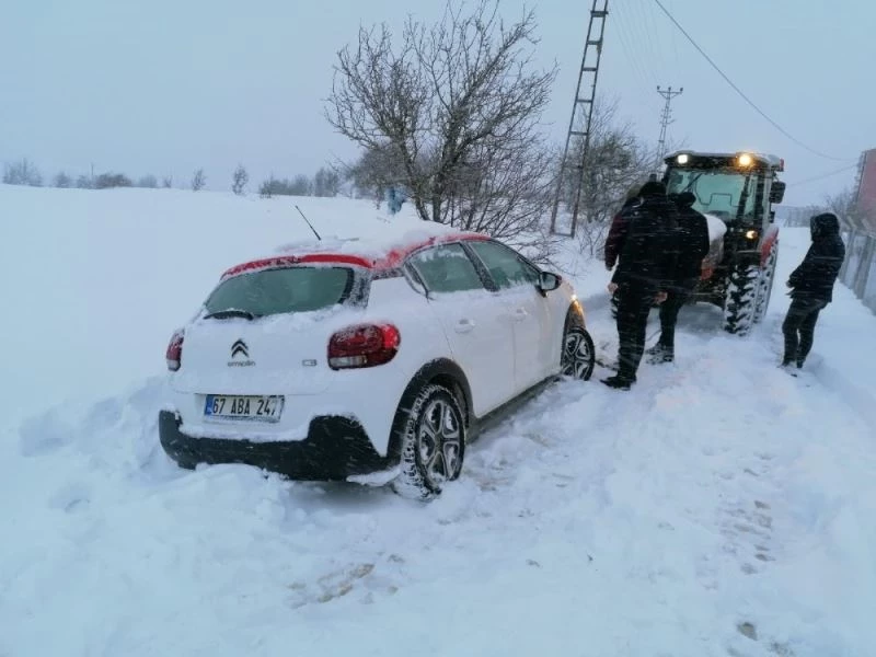 Karabük’ün Eflani ve Ovacık ilçeleri sabah saatlerinde aniden bastıran kar yağışı sonrası beyaza büründü. Kar kalınlığının 25 santimetreyi bulduğu Ovacık ilçesinde kardan dolayı kontrolden çıkan otomobil kara saplanarak mahsur kaldı. Emre K. idaresindeki 67 ABA 247 plakalı Citroen marka otomobil, vatandaşların yardımına rağmen bulunduğu yerden çıkartılamayınca, traktörle çekilerek kurtarıldı.