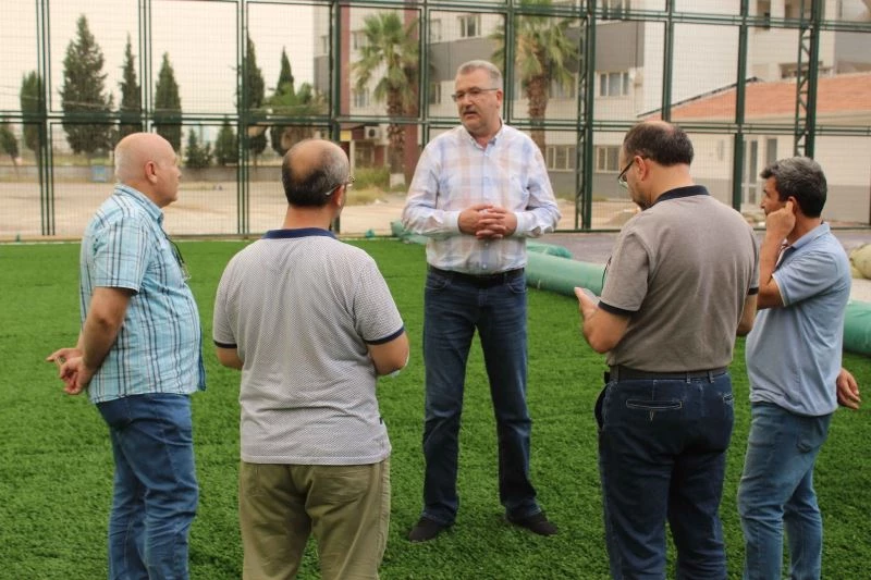 Karacabey Belediye Başkanı Ali Özkan, Teknik ve Endüstri Meslek Lisesi’nde yapımı süren hala sahayı ziyaret etti.