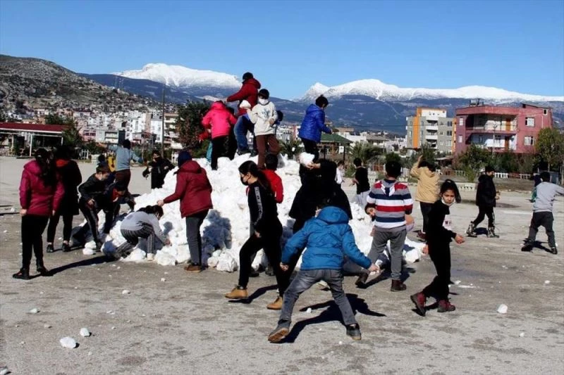 ADANA - Karaisalı ilçesinde, öğrencilerin eğlenebilmesi için okul bahçelerine kamyonlarla kar taşındı.