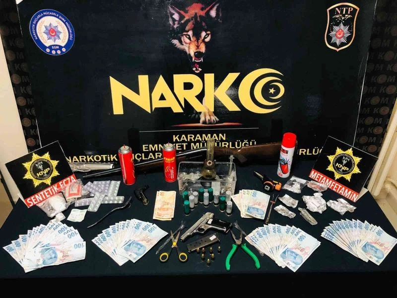 Operasyonun düğmesine dün sabaha karşı basıldı. Cumhuriyet Başsavcılığının koordinesinde Karaman Emniyet Müdürlüğü Narkotik Suçlarla Mücadele Şubesi ekipleri, kentte uyuşturucu ticareti yapanlara yönelik Karaman merkez başta olmak üzere Gaziantep, Konya ve Antalya illerinde eş zamanlı olarak operasyon yaptı. Resmi ve sivil olmak üzere çok sayıda polisin katıldığı operasyonda 2’si kadın 18 kişi evlerinde yakalanarak gözaltına alınmıştı. Şüphelilerin evlerinde yapılan aramalarda ise 230 gram metamfetamin, 100 gram esrar, 15 gram eroin, 120 adet reçeteye tabi hap, 1 adet tabanca, 21 adet mermi, 1 adet tüfek ve uyuşturucudan elde edildiği düşünülen 6 bin 815 TL ele geçirildi.