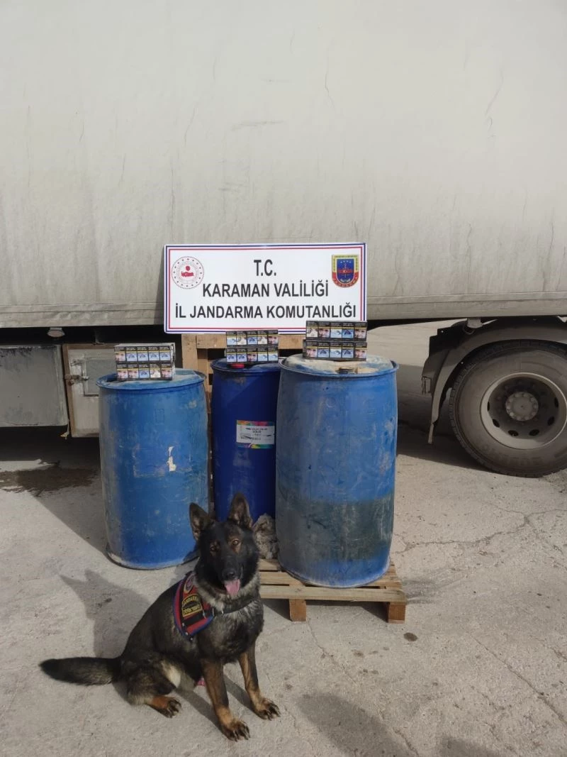 Edinilen bilgiye göre, Karaman İl Jandarma Komutanlığına bağlı Kaçakçılık ve Organize Suçlarla Mücadele Şube Müdürlüğü ekipleri, Karaman-Ereğli karayolu üzerinde Ş.K. (30) idaresindeki tırı şüphe üzerine durdurdu. Tırda hassas burunlu köpekle arama yapan ekipler 100 paket kaçak sigara ile 460 litre kaçak mazot ele geçirdi.