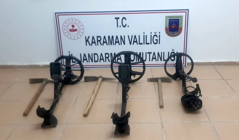 Karaman’da tarihi eser bulmak amacıyla kaçak kazı yaptıkları ileri sürülen 3 kişi, jandarma tarafından kazıda kullandıkları malzemelerle birlikte yakalandı.