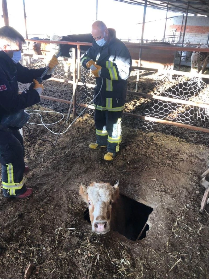 Edinilen bilgiye göre, saat 08.30 sıralarında Urgan Mahallesi 1991 Sokak’ta Özay Küçükbingöl’e ait besi ahırında bulunan bir inek, kullanılmayan kuyuya düştü. Besi sahibi tarafından inek kuyudan çıkarılamayınca 112 acil servisi aranarak yardım istendi. İhbar üzerine olay yerine itfaiye ekipleri sevk edildi. İneğin düştüğü kuyu ağzının dar olması nedeniyle itfaiye ekipleri, hayvanın zarar görmemesi için titiz bir çalışma gerçekleştirdi. Kuyu ağzını beton kırma aletiyle genişleten itfaiye ekipleri, ineği düştüğü kuyudan bir zarar görmeden çıkardı.