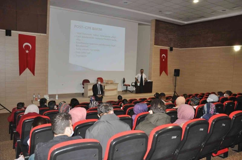 Uzm. Dr. Ali Avcı ve Sosyolog Selma Soytürk tarafından, Karaman Eğitim ve Araştırma Hastanesi toplantı salonunda verilen eğitimde, iletişim sırasında etkili iletişim becerileri, stres yönetimi ve stres ile başa çıkmak konuları, temel yaşam desteği, ileri kardiyak desteği ve acil tıbbi müdahale teknikleri anlatıldı. Eğitimin sonunda, İl Sağlık Müdürlüğü Sağlık Hizmetleri Başkanı Uzm. Dr. Mehmet Serkan Yurdakul tarafından uygulamalı CPR eğitimi de verildi. Verilen eğitime tüm 112 personeli katıldı.
