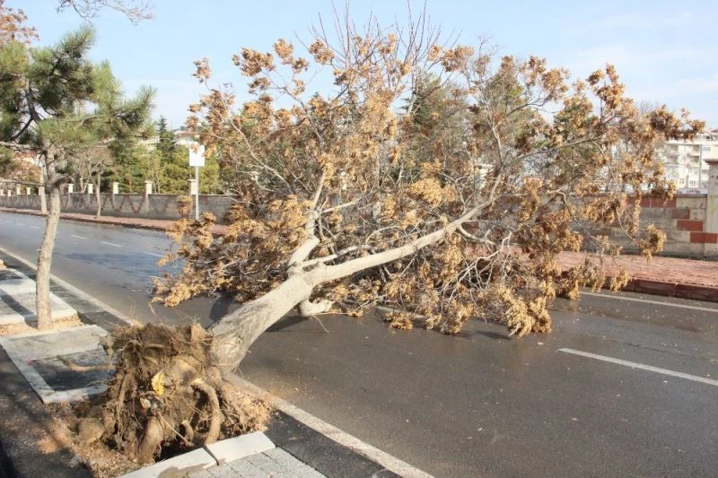 Karaman’da şiddetli rüzgar, yol kenarında ve kaldırım üzerinde bulunan iki ağacın devrilmesine neden oldu.