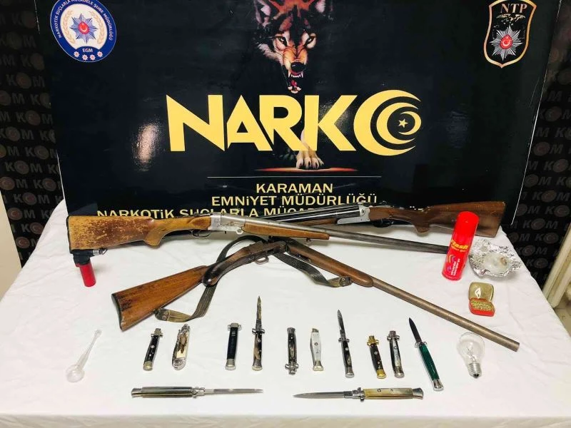 Edinilen bilgiye göre, Cumhuriyet Başsavcılığınca yürütülen soruşturma çerçevesinde, İl Emniyet Müdürlüğü Narkotik Suçlarla Mücadele Şubesi ekipleri, kentte uyuşturucu satışı yapanlara yönelik çalışma başlattı. Belirlenen adreslere sabaha karşı eş zamanlı operasyon yapan ekipler, haklarında yakalama kararı bulunan 5 şüpheliyi gözaltına aldı. Şahısların evlerinde yapılan aramalarda 13 gram metamfetamin, 15 gram esrar, 121 adet reçeteye tabi hap, 3 gram eroin, 12 adet bıçak, 3 adet tüfek ile 17 gram kenevir tohumu ele geçirildi. Karaman Eğitim ve Araştırma Hastanesinde sağlık kontrolünden geçirilen şüpheliler emniyete götürüldü. Emniyetteki işlemlerin ardından adliyeye sevk edilen zanlılardan 2’si mahkemece tutuklanarak Karaman M Tipi Kapalı Cezaevine gönderilirken, 3 kişi ise adli kontrol şartıyla serbest bırakıldı.