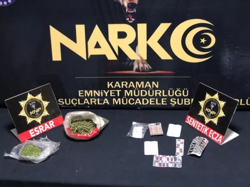 Edinilen bilgiye göre, Karaman İl Emniyet Müdürlüğü Narkotik Suçlarla Mücadele Şubesi ekipleri, kentte uyuşturucu ticareti yaptıkları ileri sürülen H.G., M.Ö.S., F.Y. ve H.G. isimli kişileri yakalayarak gözaltına aldı. Şüphelilerin gösterdikleri yerde yapılan aramalarda 105 gram esrar ve reçeteye tabi 49 hap ele geçirildi. Emniyetteki işlemlerin ardından adliyeye sevk edilen şüpheliler, çıkarıldıkları mahkemece tutuklanarak Karaman M Tipi Kapalı Cezaevine kondu.