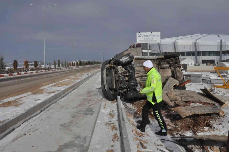 Karaman’da yola çıkan köpeğe çarpmamak için direksiyonu çeviren sürücünün kullandığı hafif ticari araç, kontrolden çıkarak stadyumun şantiye alanına devrildi. Kazada araçta yolcu olarak bulunan 1 kişi yaralandı.