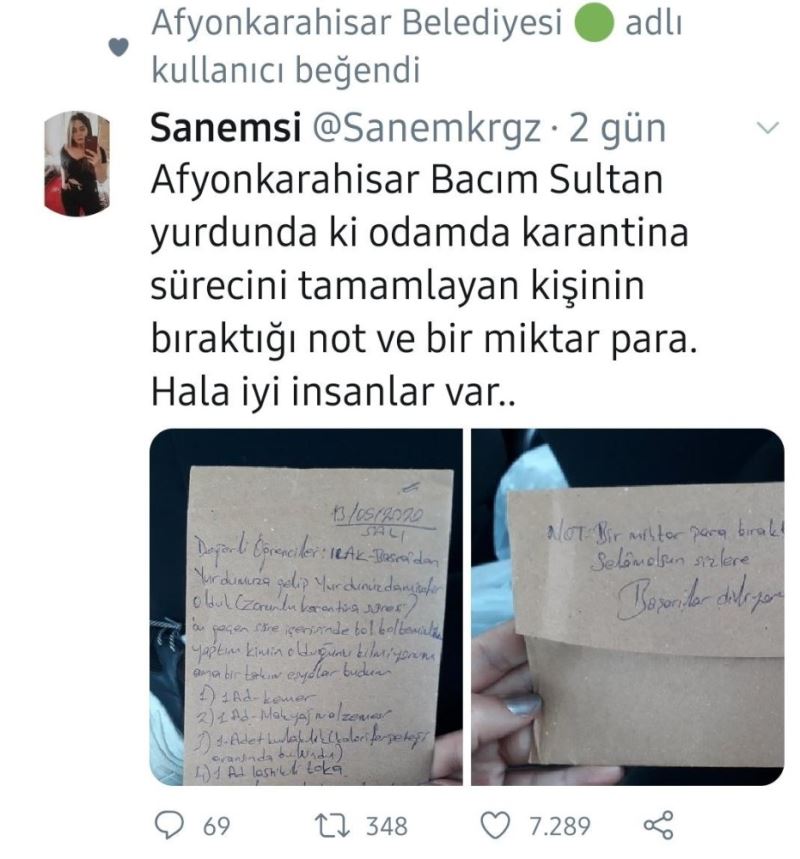 Zarfı alan kız öğrencide zarfın fotoğrafını sosyal medya hesabından paylaşarak, “Afyonkarahisar Bacım Sultan Kız Öğrenci Yurdundaki odamda karantina sürecini tamamlayan kişinin bıraktığı not ve bir miktar para. Hala iyi insanlar var” ifadelerini yazdı.