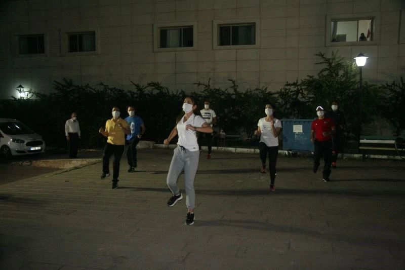 Kilis’te KYK yurdunda korona virüs karantinasında bulunan vatandaşlar, İstiklal Marşı söyledikten sonra antrenörler eşliğinde spor yaptı.