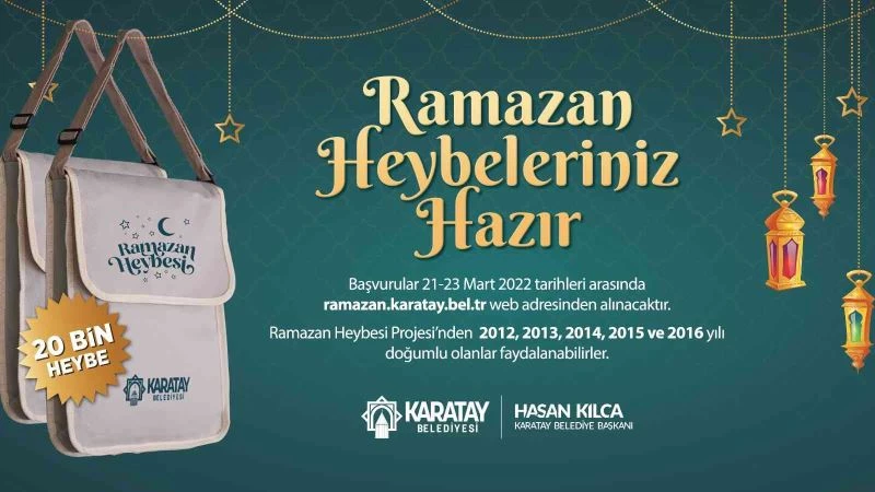 Geçtiğimiz yıl olduğu gibi bu yıl da çocukların Ramazan heyecanı ve coşkusunu yaşamasını isteyen Karatay Belediyesi, çocuklar için özel bir sürpriz hazırladı. “Ramazan Heybeleriniz Hazır” projesi kapsamında Karatay Belediyesi, ramazan.karatay.bel.tr adresine kayıt yaptıran 2012, 2013, 2014, 2015 ve 2016 yılı doğumlu 20 bin Karataylı çocuğa “Ramazan Heybesi” hediye edecek. Hazırlanan “Ramazan Heybesinin” içerisinde; Ramazan Günlüğü, Ramazan süsü, Ramazan Fitresi Çocuk Kumbarası, bileklik ve iftariyelik gibi eğlendirici, bilgilendirici, öğretici daha birçok sürpriz hediyeler bulunuyor.
