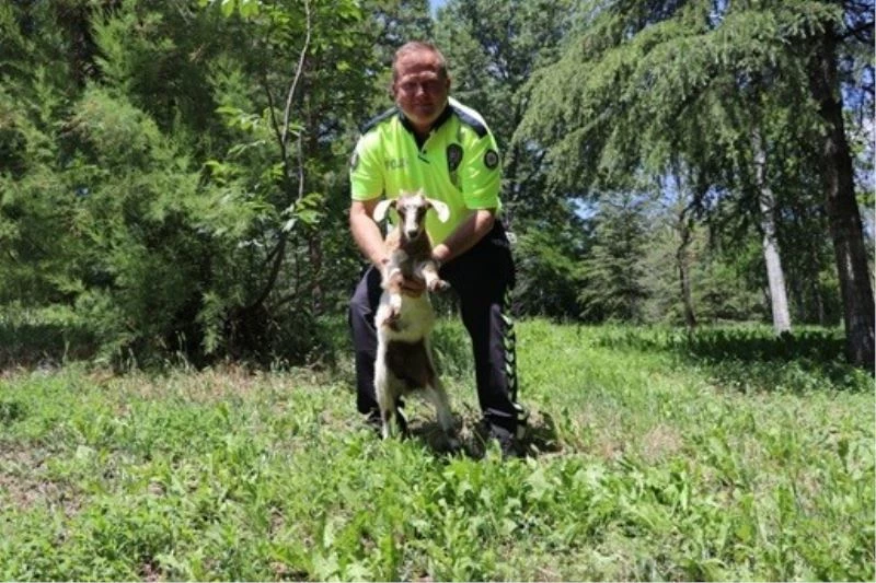 Karayolunda başıboş dolaşan oğlak trafik polislerince koruma altına alındı