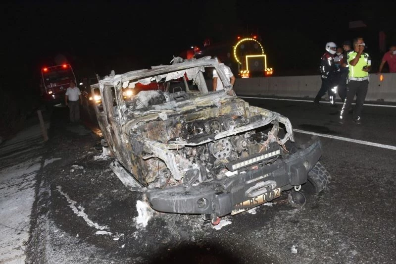 Bölge Trafik ekipleri tarafından karayolu ulaşımı gidiş ve dönüş yönünde trafiğe kapatılırken, alev alev yanan araca itfaiye ekiplerinin yaptığı müdahaleye rağmen araç tamamen yandı. Araç içindeki sürücü ve üç kişi araçtan çıkarak kurtuldu.