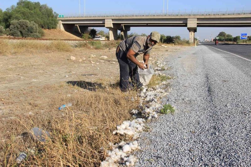 Aydın’da tarlalarda pamuk hasadı devam ederken dar gelirli aileler de karayolu kenarına traktör ve kamyonlardan saçılan pamukları toplayıp aile bütçelerine katkıda bulunuyorlar.