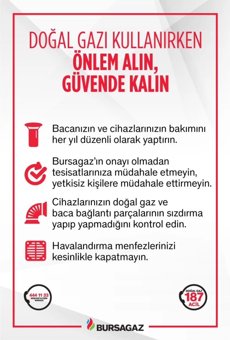 Bursagaz, “Bacanızın ve cihazlarınızın bakımını her yıl düzenli olarak yaptırın. Bursagaz’ın onayı olmadan tesisatlarınıza müdahale etmeyin ve yetkisiz kişilere müdahale ettirmeyin. Cihazlarınızın doğal gaz ve baca bağlantı parçalarının sızdırma yapıp yapmadığını kontrol edin. Havalandırma menfezlerinizi kesinlikle kapatmayın” uyarılarında bulundu.