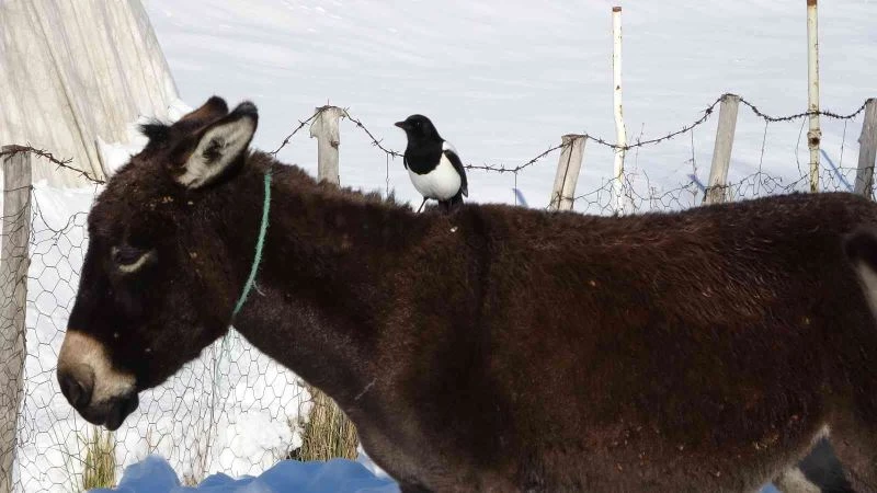 Muş’ta etkili olan yoğun kar yağışı nedeniyle doğada yem bulmakta güçlük çeken saksağanın köydeki eşeklerin başına bela olması, ortaya gülümseten görüntüler çıkardı.
