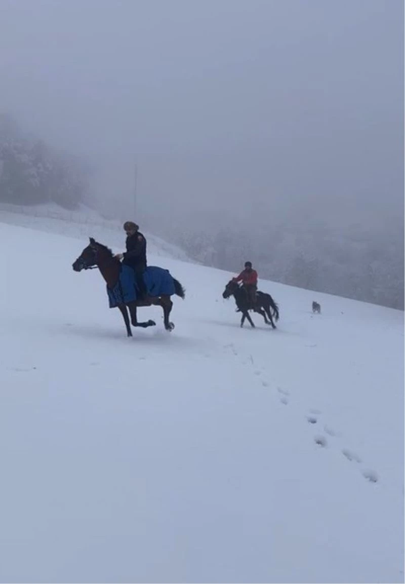 Tokat’ta karla kaplı ormanlık alanda atlı safari, renkli görüntüler oluşturdu.