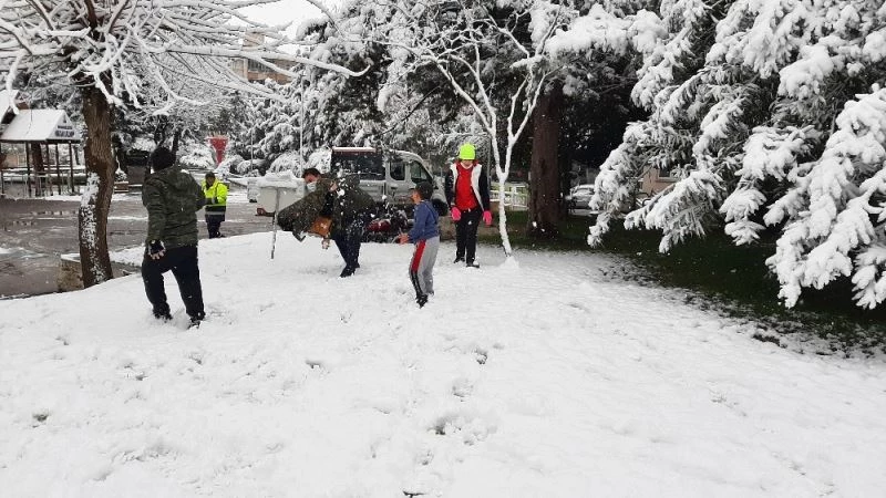 Mevsimin ilk kar yağışının yaşandığı Adıyaman kent merkezinde yetişkinler çocuklar gibi kartopu oynayıp, kardan adam yaparak eğlendi.