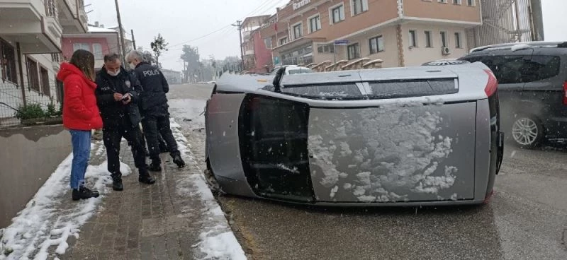 Yalova’da karlı zeminde yokuştan inmeye çalışan otomobil, kayarak ağaca çarpıp takla attı.