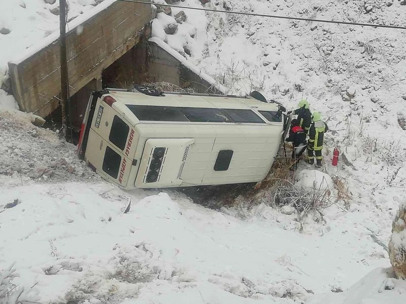 Karda yoldan çıkan yolcu minibüsü şarampole yuvarlandı: 2 yaralı