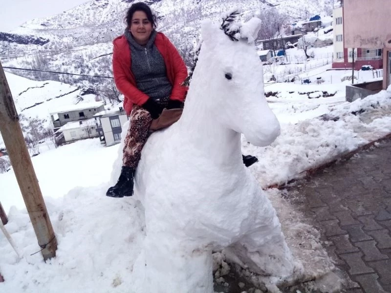 Şırnak’ın Beytüşşebap ilçesinde etkili olan kar yağışı sonrası vatandaşlar kardan adam yerine kardan at yaparak sırtına bindi.