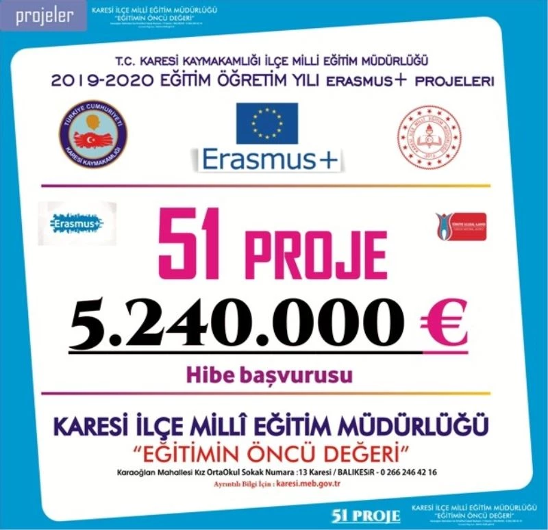 Karesi İlçe Milli Eğitim Müdürlüğü koordinesinde 2019-2020 eğitim öğretim yılı çerçevesinde Avrupa Birliği Erasmus+ projelerine rekor hibe başvurusu yapıldı. Karesi İlçe Milli Eğitim Müdürlüğü’ne bağlı kurumlar tarafından toplam 51 proje kaleme alındı ve bu projelerin toplam hibe başvurusu 5 milyon 240 bin Euro’yu buldu.