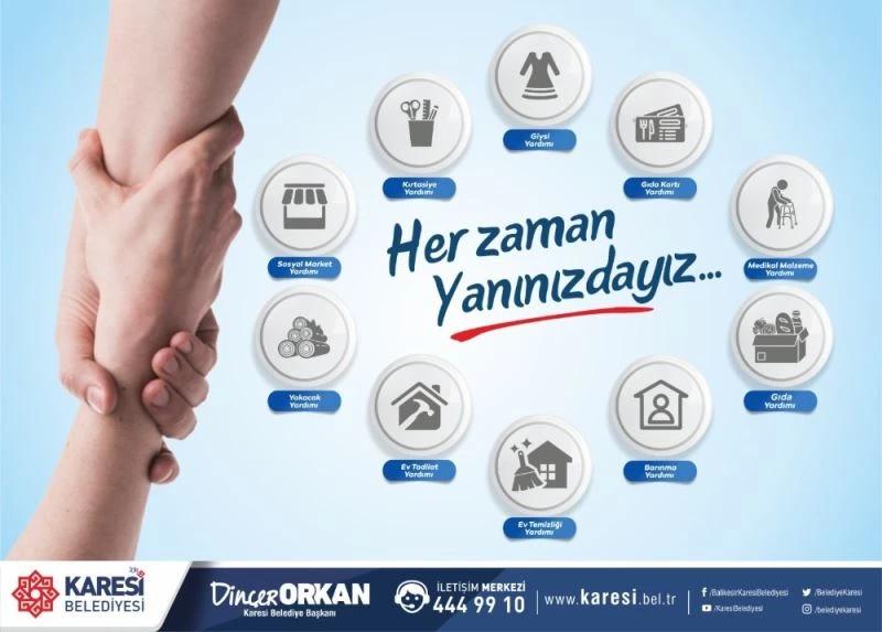 Karesi Belediyesi, ’insan odaklı, sosyal belediyecilik’ çalışmalarıyla örnek olmaya devam ediyor. "Karesi’de kimse kendini yalnız hissetmeyecek" sloganıyla çalışmalarına yön veren Karesi Belediye Başkanı Dinçer Orkan’ın talimatıyla Karesi Belediyesi ihtiyaç sahibi, bakıma muhtaç, kimsesiz, yaşlı ve engelli vatandaşların yanında olmaya devam ediyor. Karesi Belediyesi, sosyal belediyecilik anlayışı ile gıdadan giyime, ayakkabıdan ilaca, erzaktan sıcak yemeğe, kırtasiye malzemesinden hasta yatağına kadar birçok farklı alanda yardımlarını sürdürüyor.