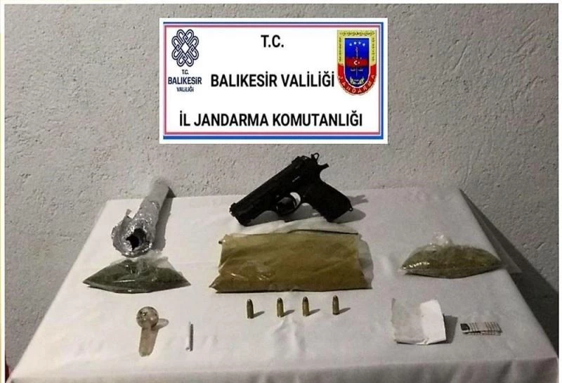 Balıkesir’in Karesi ilçesinde jandarma ekipleri bir araçta yaptıkları uygulamada uyuşturucu madde ve 1 ruhsatsız tabanca ve fişeklerini ele geçirdi.