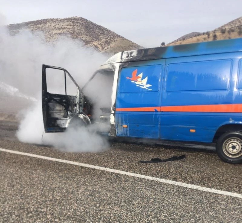 Adıyaman’ın Gölbaşı ilçesinde seyir halindeki kargo aracı cayır cayır yandı.