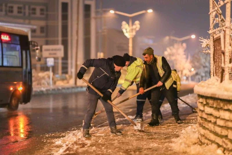 Özellikle gece saatlerinde eksi derecelere düşen sıcaklığın etkisi ile buzlanmaya karşı tuzlama ve küreme yapan ekiplerinin yanında, kaldırım temizleme ekipleri de eş zamanlı olarak çalışmalarını yürütüyor.