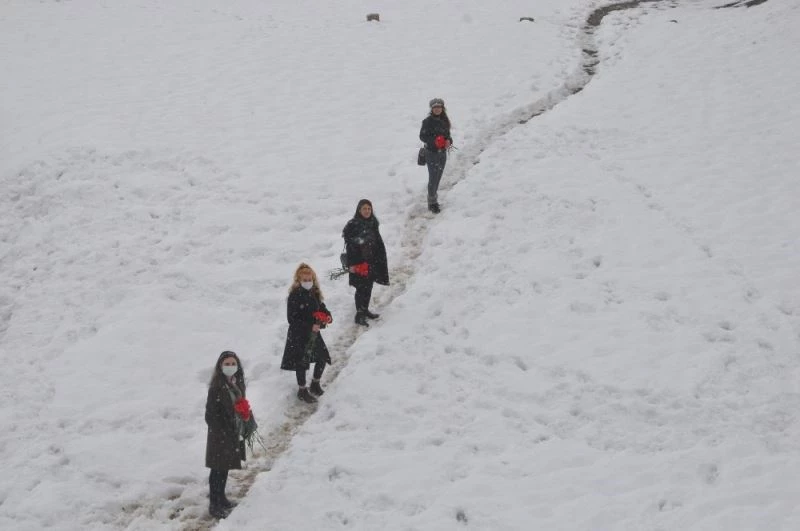 Hakkari’nin Yüksekova ilçesinde, karlı dağları aşarak kadınlara karanfil dağıttılar.