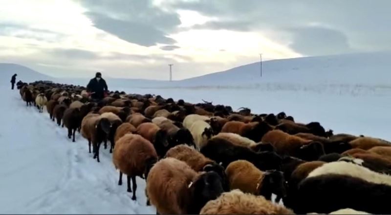 Karlı yollarda küçükbaş hayvanların zorlu yolculuğu