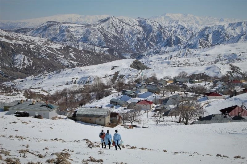 19) ile mücadelede aşı çalışmalarını sürdüren sağlık çalışanları, karlı tepeleri aşarak 90 yaşındaki Paşa dedenin aşışını yaptı.