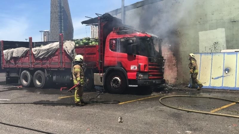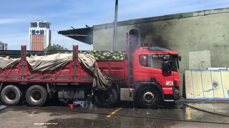 Ataşehir sebze ve meyve halinde bulunan karpuz yüklü TIR’da henüz bilinmeyen bir nedenle yangın çıktı. Alev alev yanan TIR’da bulunan tonlarca karpuz ise yenilemez hale geldi.