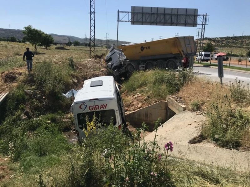 Gaziantep’te kontrolünü kaybeden bir yük tırı karşı şeride geçerek işçi servisine çarptı. Kazada işçi servisinin boş olması büyük bir faciayı önlerken, iki aracın şoförü ile servisinde bulunan bir kişi daha yaralandı.