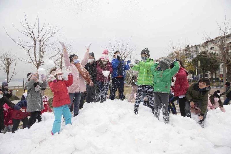 Karşıyakalı çocuklara deniz kenarında kar sürprizi
