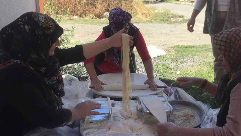 Kadınlarla imece usulü erişte kestiklerini ifade eden Yüksel Ak, “Hamuru kündeledik, şimdi de gelinler toplandı kesiyoruz. Kavuracağız fırında, yani kış rızkı. İki gelinim, komşum birbirimize yardım ederek yapıyoruz. Kışın yoğurt çorbasıyla, hoşafla yüyeceğiz” dedi.