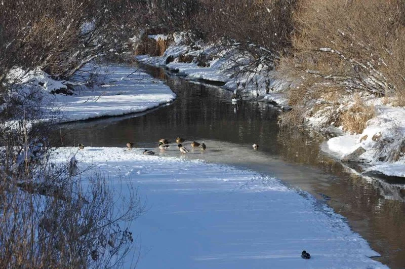 Kars’ta aşırı soğuklardan dolayı büyük çoğunluğu tamamen donan Kars Çayı’nın açık kalan bölgeleri yaban ördeklerine ev sahipliği yapıyor.