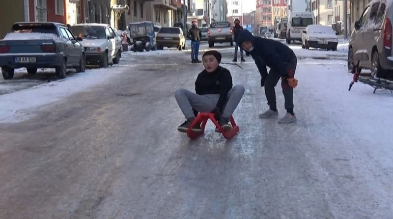 Kars’ta kızakları ile kayan çocuklar, buz tutan cadde ve yokuşların yolunu tuttu. Soğuğa aldırış etmeden kızak kayan çocuklar gönüllerince eğlendi.