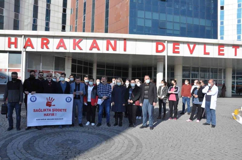 Harakani Devlet Hastanesi önünde toplanan sağlık çalışanları adına açıklama yapan Sağlık sen Kars Şube Başkanı Muharrem Koskalan, “Bugün burada toplanma nedenimiz hastanemiz çocuk servisinde görev yapan Enes Sefa Yurduöz tedavi sırasında hasta odasına gittiği zaman hasta yakını tarafından fiziksel şiddete maruz kalarak darp edildi. Daha 22 yaşında mesleğinin ilk yıllarında böyle bir şiddete maruz kalması bizleri derinden üzmüştür. Hep birlikte sağlık çalışanlarına uzanan eller kırılsın diyoruz” dedi.