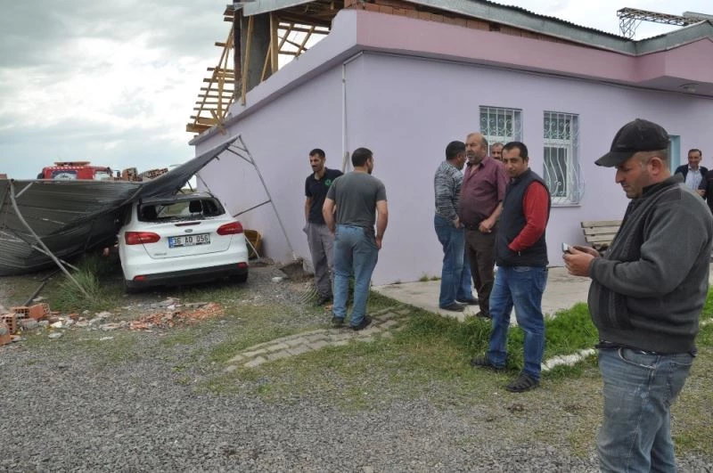 Kars’ta öğle saatlerinde oluşan hortum 5 tonluk kamyonu devirirken, çatıları da uçurdu.