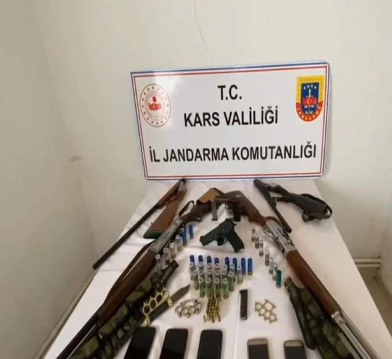 Kars İl Jandarma ve Arpaçay İlçe Jandarma Komutanlığı ekipleri, Arpaçay’da önceden tespit edilen şüpheli 8 kişiye ait 5 ev ve eklentilerine eşzamanlı operasyon düzenlendi. Ekipler şüpheli 8 kişiyi gözaltına alırken, ev eklentilerinde yapılan aramada, 1 tabanca, 1 kurusıkı tabanca, 4 av tüfeği ve silahlara alt 3 şarjör, 2 muşta, 1 muştalı bıçak, 5 cep telefonu, 2 kütüklük ve 93 mühimmat ele geçirildi.