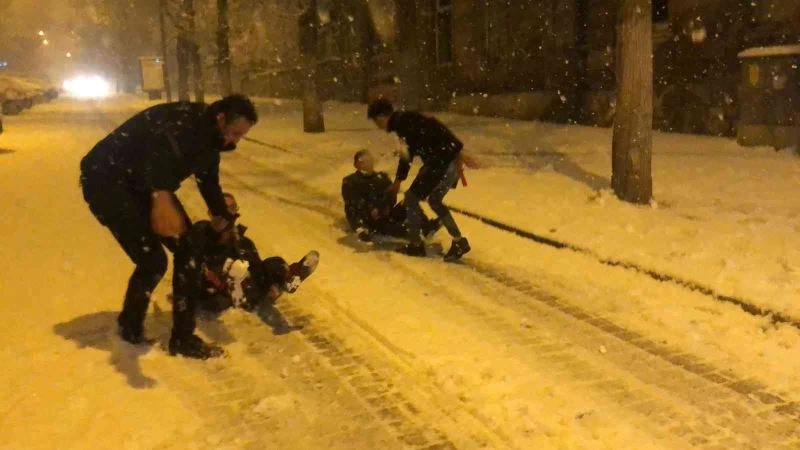 Kars’ta lapa lapa yağan kar, vatandaşları sokaklara döktü. Kar altında gençler gönüllerince kar topu oynadı, naylon poşetlerin üstüne oturarak kaydı.