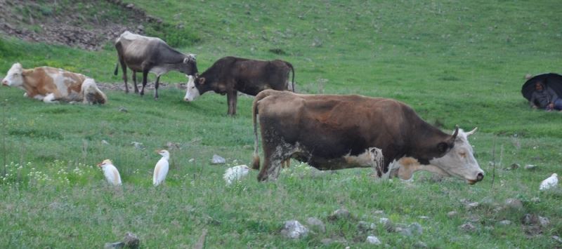 Kars Çerme köyü girişinde otlaklarda otlayan büyükbaş hayvanların yanında görülen kuşlar daha sonra uçarak gözden kayboldu.