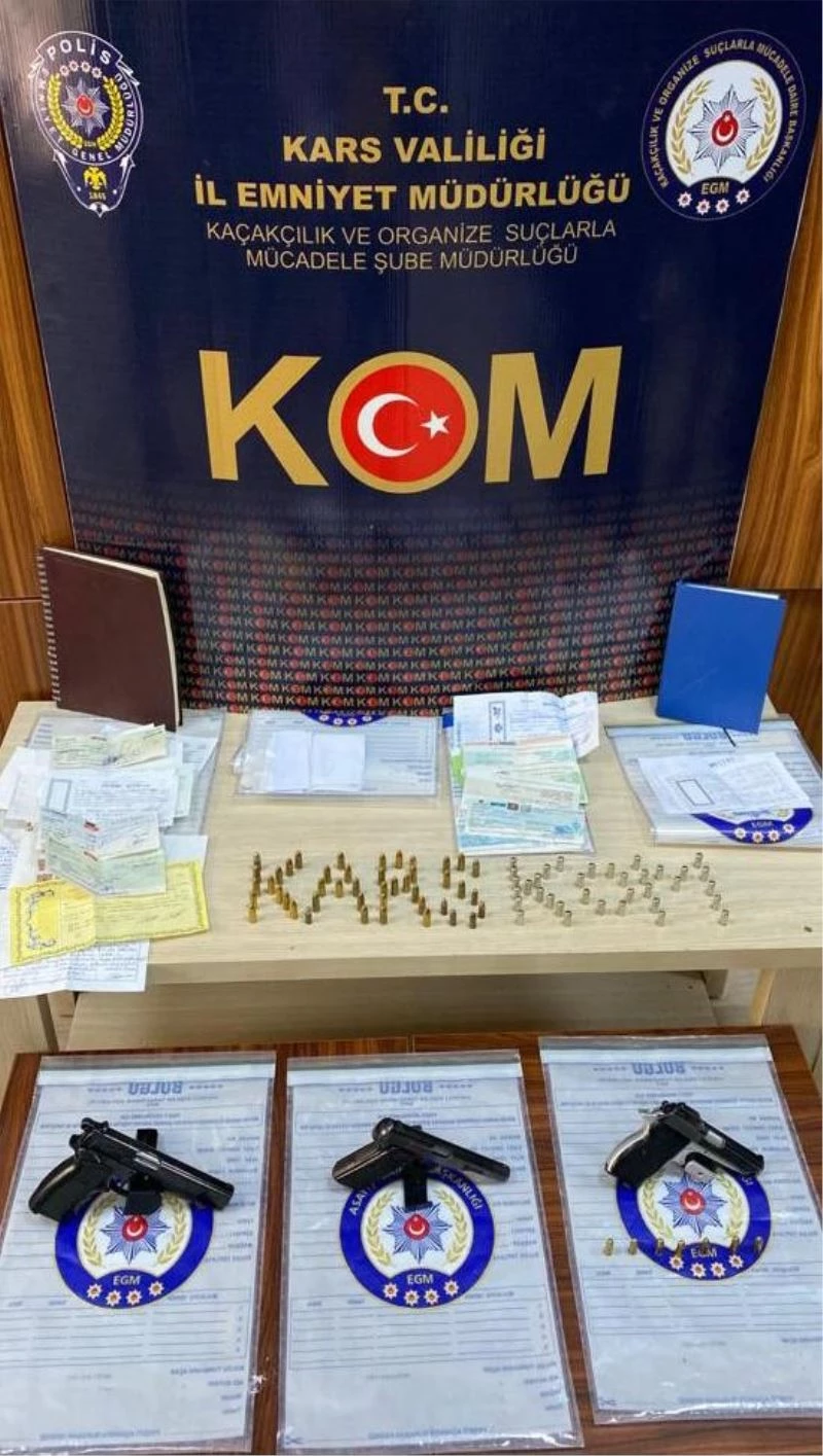 Kars Emniyet Müdürlüğü KOM Şube Müdürlüğü’nce Kars Cumhuriyet Başsavcılığı koordinesinde tefecilik suçu kapsamında yapılan operasyonda A.E. (55), C.B. (48), M.Ş.C. (48), K.Y. (80), E.G. (59) ve G.Y. (31) yakalanarak gözaltına alındı. Şüphelilerin ikamet, işyeri ve araçlarında yapılan aramalarda, 2 adet ruhsatsız tabanca, 1 adet kurusıkı tabanca ve bunlara ait 97 adet fişek, 45 adet farklı şahıslara ait çek ve senet ve suçlamalarla bağlantılı çeşitli belgeler ele geçirilerek muhafaza altına alındı.