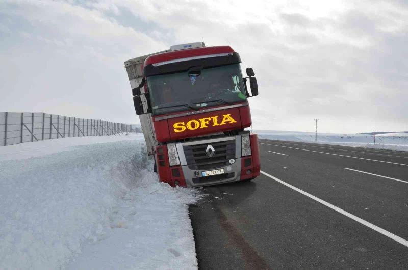 Kars’ta sürücüsünün direksiyon hakimiyetini kaybettiği tır yoldan çıktı. Devrilmekten son anda kurtulan tır maddi hasar meydana geldi.