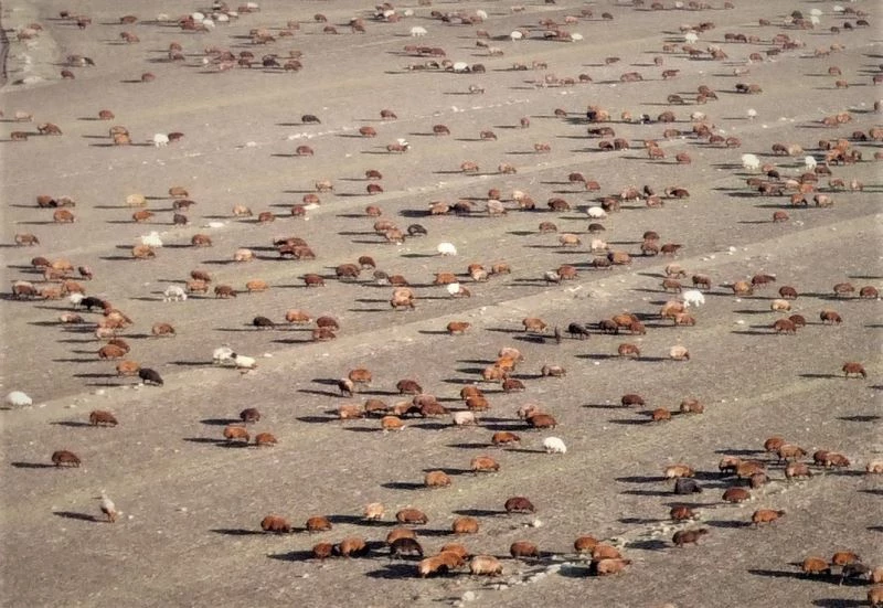 Binlerce koyunun bozkırda yolculuğu havadan görüntülendi. Dronenin sesinden korkarak koşan koyunlar kameralara yansıdı.