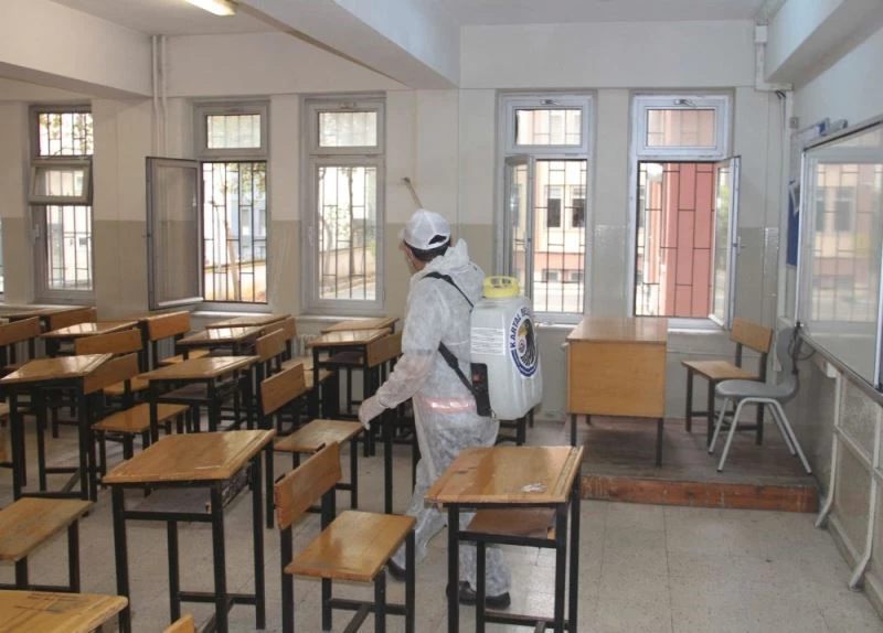 Kartal Belediyesi Temizlik İşleri Müdürlüğü’nün alanında uzman ekipleri tarafından yürütülen çalışmalar kapsamında; okul binalarının içleri, sınıflar, tırabzanlar, tuvaletler, öğretmen odaları, kapılar, masa ve sıralar, okul bahçeleri ile öğrencilerin temas edebilecekleri bütün alanlar dezenfekte ediliyor.