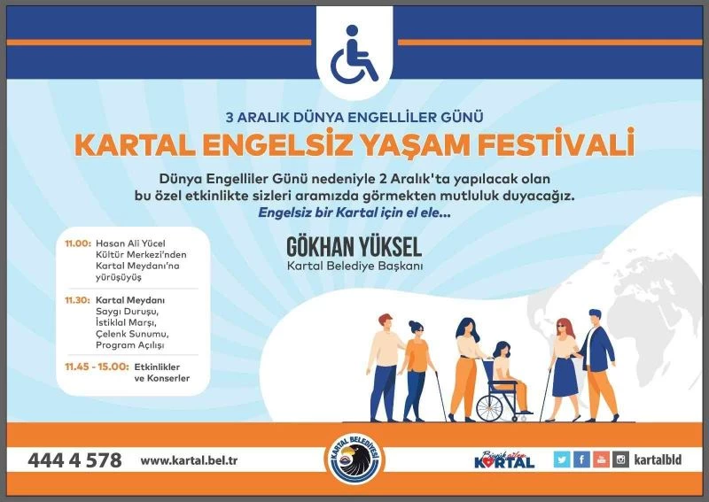 2 Aralık Perşembe günü Saat 11.00’da Kartal Hasan Ali Yücel Kültür Merkezi önünden Kartal Meydanı’na doğru yapılacak olan ‘Engelsiz Kartal Yürüyüşü’ ile başlayacak olan Engelsiz Yaşam Festivali, saat 11.30’da Kartal Meydanı’nda Ata’ya çelenk sunumu ile devam edecek.